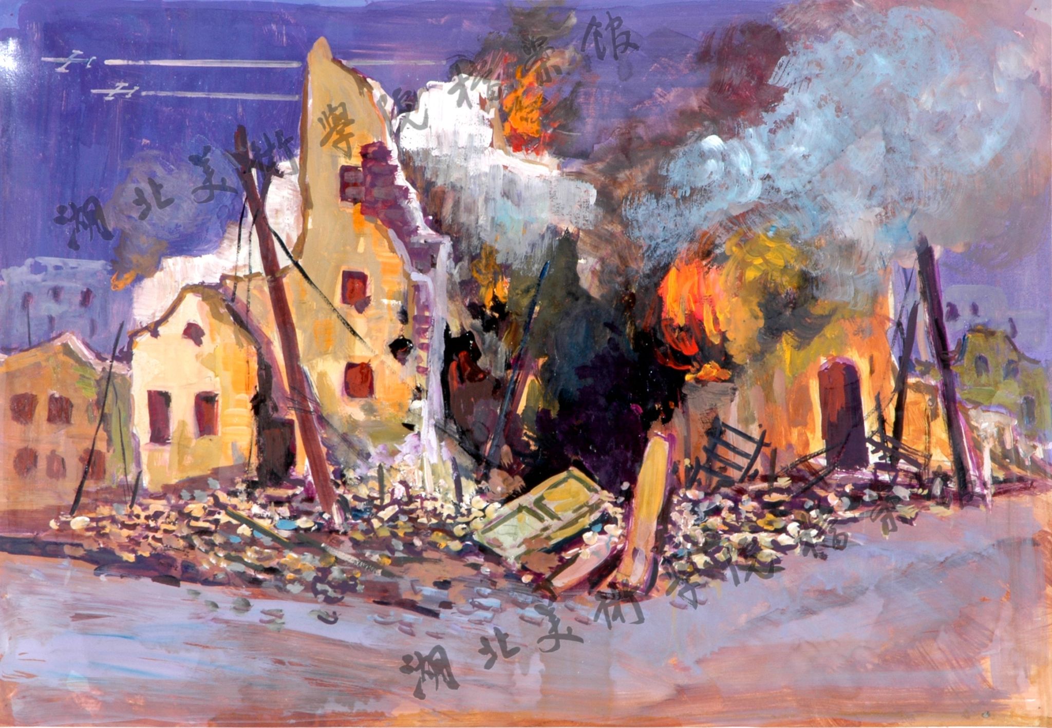 《驻地遭空袭》 48cm×31cm 水粉 1999年
