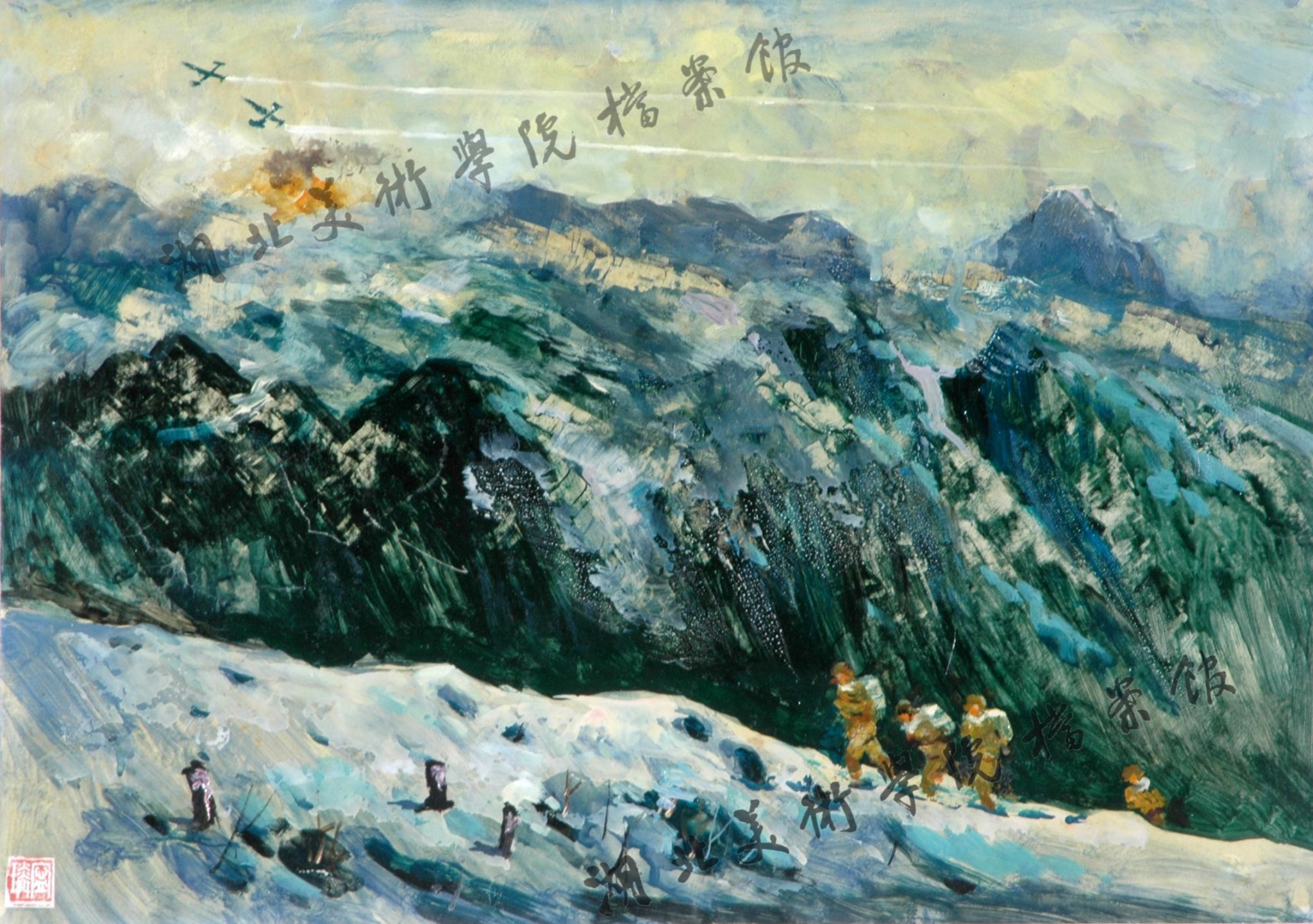 如今,105岁高龄的宁璘校友依然健在,他的人生轨迹与建校105周年的湖北美术学院同龄共振。从武昌艺专的画室到朝鲜战场的硝烟,再到景德镇陶瓷大学的三尺讲台,一生坚守“艺术报国”的赤诚信念。他笔下的抗美援朝题材作品,早已超越个人记忆的边界,成为民族集体记忆与不朽精神的载体。其中《向三八线挺进》一画,既定格了烽火岁月的壮阔瞬间,更镌刻了一代人在国家危难之际“以笔为刃”的初心与担当,这段熠熠生辉的人生印记,已永远载入百年湖美校史,终将成为一部传承红色基因、培根铸魂育人的生动教材。